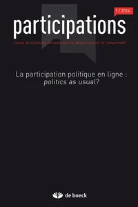 La participation politique en ligne : politics as usual? N° 8, 2014/1 - pagesPages 5 à 29La participation politique en ligne, vers un renouvellement des problématiques ?Par Laurence Monnoyer-Smith, Stéphanie WojcikPages 31 à 54La mise en technologie des projets politiques. Une approche « orientée design » de la participation en lignePar Romain BadouardPages 55 à 74Twitter, un nouveau « baromètre de l'opinion publique » ?Par Julien BoyadjianPages 75 à 95L'activisme numérique au regard du consumérisme politique : Pirates et Tea Partiers sous la loupePar Nicolas BaygertPages 97 à 126La rénovation par le web ? Dispositifs numériques et évolution du militantisme au PSPar Clément Mabi, Anaïs TheviotPages 127 à 146Offe, la démocratie dialogique et la lutte des classes : une critique participationniste du mouvement ouvrierPar Karel YonPages 147 à 172Deux logiques d'action collectivePar Claus Offe, Helmuth Wiesenthal, article traduit de l’anglais par Karel YonPages 173 à 188La démocratie environnementale au défi des triangles de fer : ouvrir la fabrication des politiques publiques à la société civilePar Yves Montouroy