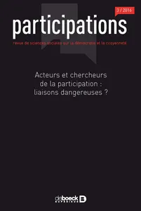 Acteurs et chercheurs de la participation : liaisons dangereuses ? N° 16, 2016/3 - pagesPages 5 à 17Introduction. Chercheurs et acteurs de la participation : liaisons dangereuses ou collaborations fécondes ?Par Loïc Blondiaux, Jean-Michel Fourniau, Clément MabiPages 19 à 43Les usages de la réflexivité dans l’entreprise participative. Un enjeu identitaire aux implications pratiques, théoriques et marchandesPar Judith Ferrando y Puig, Guillaume PetitPages 45 à 65Les « méthodologues » de la démocratie délibérative. Entre activisme citoyen et recherche scientifique au sein du G1000 et du G100Par Vincent Jacquet, Min ReuchampsPages 67 à 88Méthodologie participative : négociations multiples et reconfigurations des relations entre partenaires. Ateliers cartographiques dans l’archipel des MarquisesPar Frédérique ChlousPages 89 à 112Observer la fabrique de la ville à Bruxelles : un détour par la participationPar Ludivine Damay, Florence DelmottePages 113 à 135L’hybridation entre recherche et pratique : une condition pour faire progresser les pratiques de concertation d’un grand maître d’ouvragePar Étienne Ballan, Jean-Marc DziedzickiPages 137 à 166Dispositifs participatifs et asymétries de pouvoir : expliciter et interroger les positionnementsPar Cécile Barnaud, Patrick d’Aquino, William’s Daré, Raphaël MathevetPages 167 à 193Un sens commun délibéré. Retour sur une participation au processus de rédaction d’un avis du CESE sur la concertationPar Mathieu Brugidou, Arthur JobertPages 195 à 222Quand le savant devient politique. Sociologie de l’expertise du think tank Terra NovaPar Camilo ArgibayPages 223 à 248« Négocier pour mieux lutter » : définition des problèmes publics et stratégies de mobilisation en Guadeloupe (2009)Par Pierre OdinPages 249 à 265Quand la sociologie critique devient une glace déformantePar Luigi Bobbio, Antonio FloridiaPages 267 à 283Comprendre le désintérêt des citoyens pour la participation : un chantier à venir ?Par Jessica Sainty