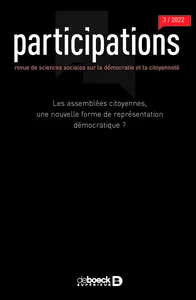 Les assemblées citoyennes, une nouvelle forme de représentation démocratique ? N° 34, 2022/3 - pagesPages 5 à 36Les assemblées citoyennes, une nouvelle forme de représentation démocratique ?Par Hélène Landemore, Jean-Michel FourniauPages 37 à 79Des citoyennes délibératives et des citoyens délibératifs : la Convention citoyenne pour le climat face à la délibérationPar Bénédicte Apouey, Jean-Michel Fourniau, Solène TournusPages 81 à 106Engagements et processus de politisations au sein de la Convention citoyenne pour le climatPar Nathalie Blanc, Laurence GranchampPages 107 à 137Une participation entre technique et politique. Typologie des mesures de la Convention citoyenne pour le climatPar Selma TiliketePages 139 à 171Gouverner une assemblée citoyenne. Le rôle du Comité de gouvernance de la Convention citoyenne pour le climatPar Jean-Michel FourniauPages 173 à 204Les frontières négociées des assemblées citoyennes. Le cas de la Convention citoyenne pour le climat (2019-2020)Par Maxime Gaborit, Laurent Jeanpierre, Romane RozencwajgPages 205 à 235La Convention citoyenne pour le climat a-t-elle travaillé comme une assemblée parlementaire ?Par Éric BugePages 237 à 260La parlementarisation de la démocratie délibérative : Pourquoi est-ce que les élu·es institutionnalisent la participation citoyenne au sein de leur parlement ?Par Min Reuchamps, Ann-Mireille SautterPages 261 à 281La Convention citoyenne pour le climat : un dispositif hors norme parmi les assemblées citoyennes sur le climat ?Par Graham Smith, traduit par Jean-Michel Fourniau, Lise DeshautelPages 285 à 309Les marges du dicible dans et hors d’un dispositif de participation instituée : les audits citoyens de la dette à MadridPar Jessy Bailly